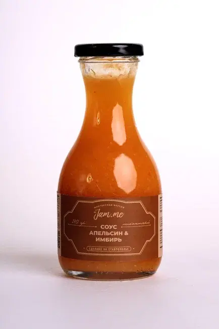 Состав: Апельсин, имбирь свежий, сахар, вода, уксус яблочный, перец кайенский молотый, загуститель - пектин яблочный, регулятор кислотности - лимонная кислота, соль