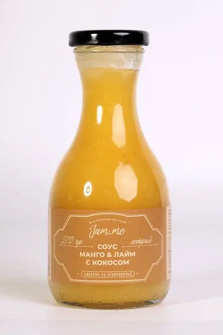 Состав: Манго, лайм, сахар, вода, кокосовая стружка, перец острый зеленый, уксус, загуститель - пектин яблочный, регулятор кислотности - лимонная кислота, соль