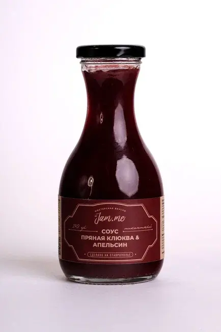 Состав: Клюква, апельсин, сахар, вода, уксус яблочный, загуститель - пектин яблочный, перец кайенский молотый, гвоздика, имбирь, корица, перец черный молотый, регулятор кислотности - лимонная кислота, соль